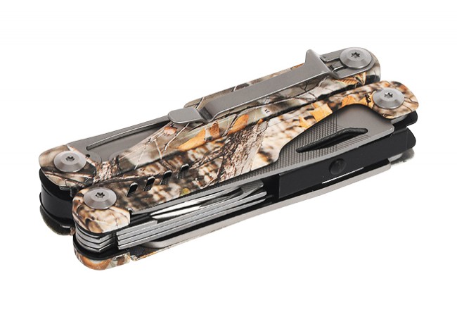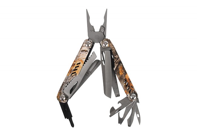 needle-nose and standard pliers, wire cutter, blade, scissors, file, openers, screwdrivers (flat, Phillips, small and large), awl, saw, multifunctional cutter, bit holder, ruler, wire stripper, carrying clip.