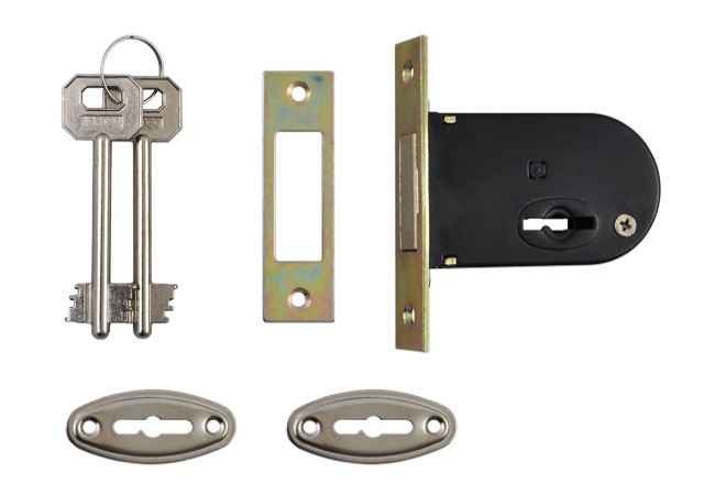 Opakowanie zawiera: zamek, zaczep, 2 rozetki, 2 klucze.