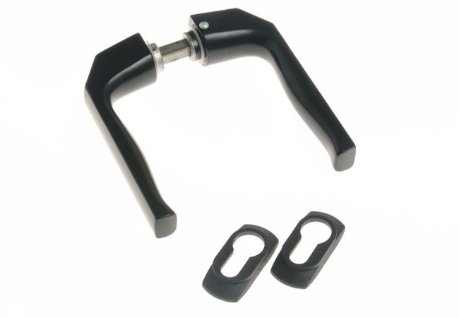 - w komplecie: 2 klamki, 2 szyldy z tworzywa wciskane na wkładkę, 2 podkładki dystansowe.