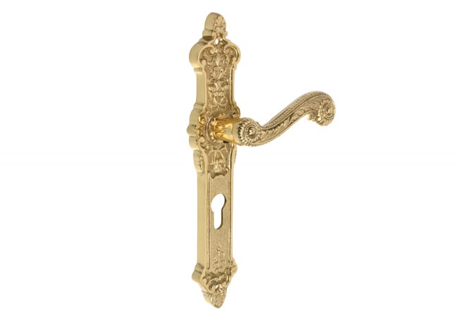 Piękne i zdobne na tyle, że same w sobie mogą stanowić element wystroju wnętrza. Ich błyszczące wykończenie z pewnością będzie przykuwać wzrok przechodniów i cieszyć ich oczy. Mimo postarzanego wyglądu klamki te są wysoce ergonomiczne i usprawniają korzystanie z drzwi wewnętrznych. Ozdobne klamki na długim szyldzie nie tylko będą pasować do wnętrz kościołów i pałaców, ale także domów urządzonych i przyozdobionych w klimacie Art Deco. Mosiądz to przecież jeden z najtrwalszych i najbardziej szlachetnych surowców służących do wykonywania klamek drzwiowych. Zapewnia on nieporównywalną trwałość i odporność produktów na uszkodzenia. Zamknięcia występują w wersji WC, na wkładkę cylindryczną oraz klasyczny, gruby klucz. Dzięki specjalnym śrubom zawartym w zestawie instalacja klamki jest bezproblemowa. Podana cena obejmuje klamkę na stronę zewnętrzną i wewnętrzną drzwi.