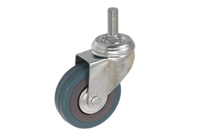Tłoczona blacha stalowa ocynkowana, w głowicy skrętnej z podwójnym łożyskowaniem kulkowym. Szara gumowa pełna opona, niebrudząca, polipropylenowa piasta, łożysko ślizgowe z ocynkowanymi osłonkami metalowymi w standardzie. Występuje w wersji z hamulcem lub bez hamulca.