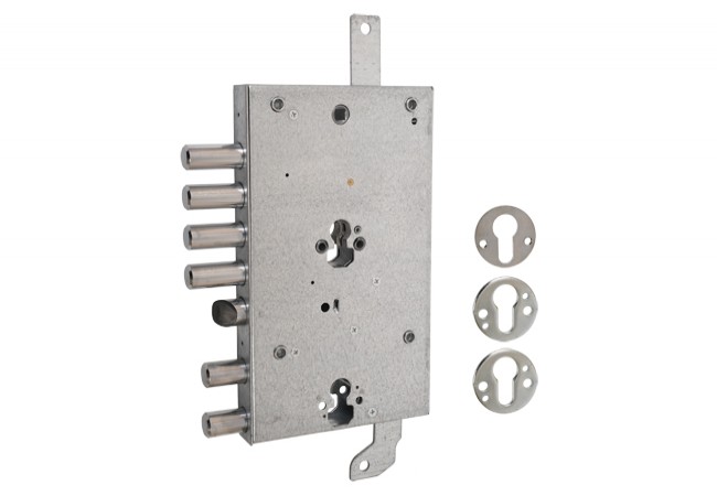 Zamek wpuszczany ATRA 467 przeznaczony do drzwi Dierre otwieranych do wewnątrz, dwusystemowy, ryglowany dwoma wkładkami bębenkowymi. Wyposażony w 6 masywnych bolcy, które nie tylko dobrze zabezpieczają drzwi, ale również świetnie je stabilizują.