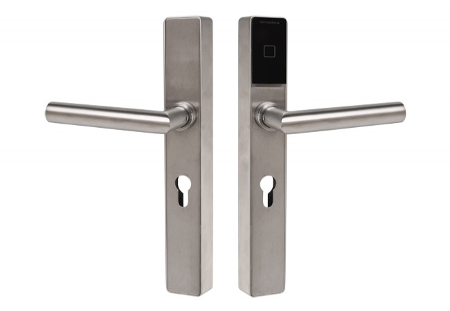 Description - Dormakab C-Lever K6 pro electronic door handle, 72 WB (wide plate, 8 mm spindle)