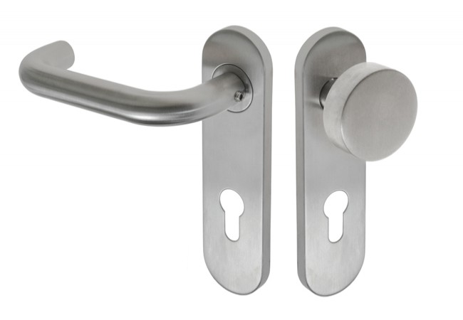Description - Dormakab OGRO Base-4 door handle-knob on long plate 72 WB, spindle 9 mm, left, INOX, (fire protection) (8100FS/7050/3020) (set)