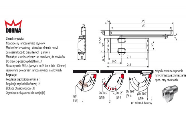 Door closers with slide rail included. Suitable for left and right doors. Can be mounted on the hinge side or opposite to the hinges. It has a special heart cam that provides an immediate reduction in resistance when opening the door.
