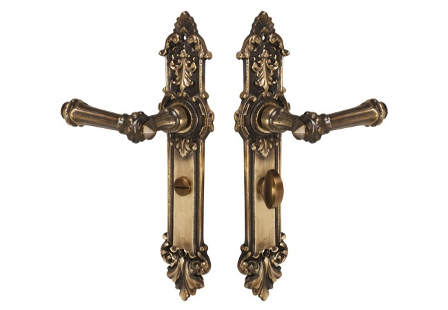 Description - Eagle-18 brass cast door handle, 90° WC spacing, patina