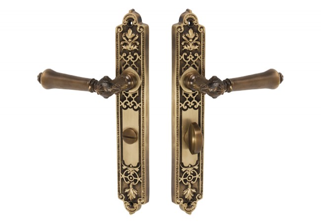 Eagle-52 brass cast door handle, 90° WC spacing, patina with spring