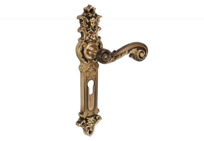 Description - Eagle-6 brass cast door handle, 72 mm spacing per insert, patina with spring