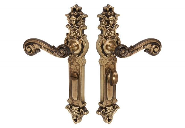 Eagle-6 brass cast door handle, 90° WC spacing, patina with spring