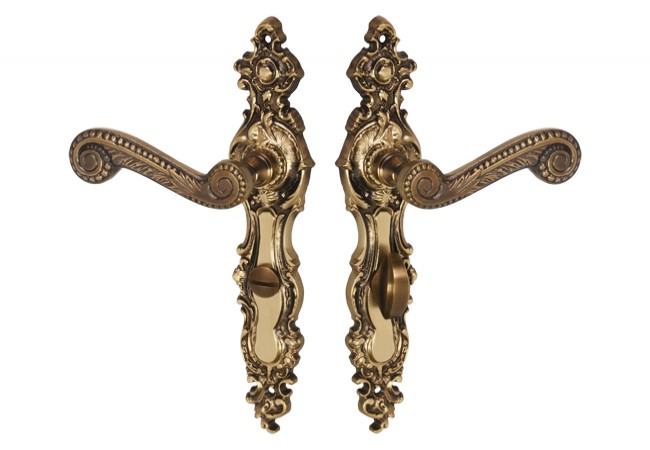 Eagle-8 brass cast door handle, 90° WC spacing, patina with spring