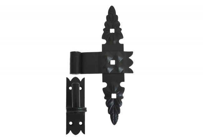 Ozdobny zawias krzyżowy, okiennicowy, kuty z hakiem w rustykalnym stylu.Malowany proszkowo na czarno.Wymiary do pobrania w pliku PDF.