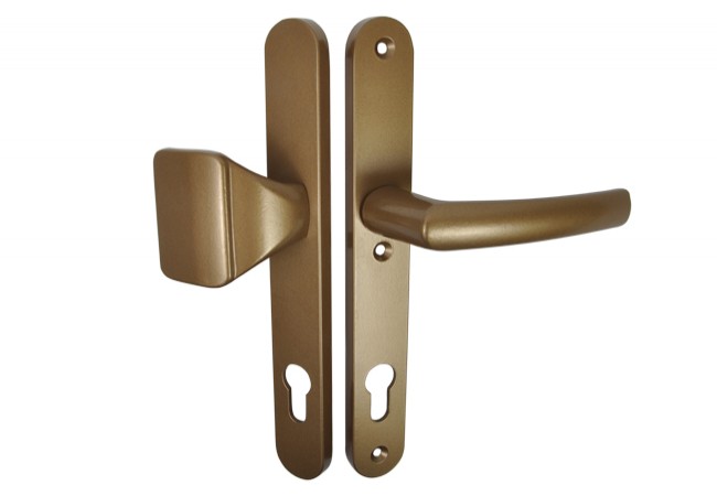 Klamka z pochwytem, na długim szyldzie w kolorze patyna.