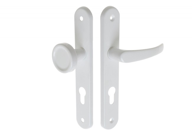 Gałka i klamka, trzpień i elementy montażowe. Opakowanie foliowe.
