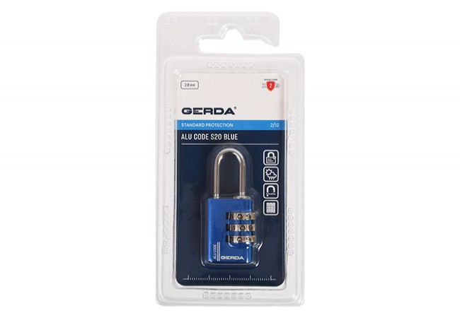 Description - Gerda ALU CODE KAS S20 aluminum combination shackle padlock, blue, blister
