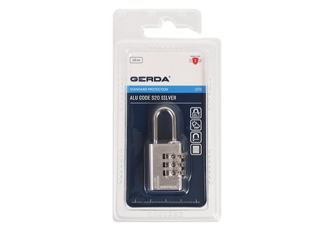 Description - Gerda ALU CODE KAS S20 aluminum combination shackle padlock, silver, blister