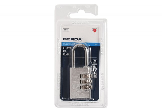 Gerda ALU CODE KAS S30 aluminum combination shackle padlock, silver, blister