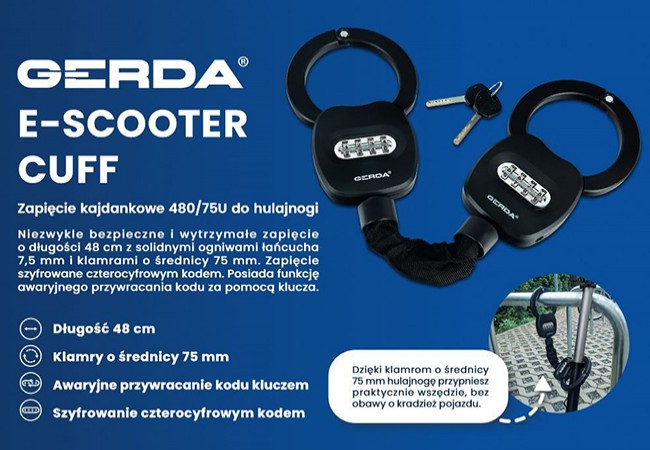 Zapięcie kajdanowe GERDA E-SCOOTER CUFF 480/75U rozwiązanie stworzone z myślą o ochronie hulajnóg elektrycznych. Zapięcie zapewnia skuteczne zabezpieczenie pojazdu w różnych warunkach. Jego unikalny design pozwala na łatwe przypięcie hulajnogi do stałych elementów, takich jak stojaki, poręcze czy ogrodzenia, co czyni je idealnym wyborem dla użytkowników dbających o bezpieczeństwo swojego sprzętu. Osłona tekstylna łańcucha w połączeniu z warstwą ochronną z PCV zapobiega zarysowaniom powierzchni hulajnogi elektrycznej, jednocześnie dodając elegancji i trwałości konstrukcji. Zapięcie hulajnogi GERDA E-SCOOTER CUFF 480/75U oferuje zamykanie na czterocyfrowy kod szyfrowy, który można dostosować do własnych preferencji. Dodatkową zaletą łańcucha jest funkcja awaryjnego przywracania kodu za pomocą kluczy dołączonych do zestawu, co zapewnia spokój ducha w przypadku zapomnienia kombinacji.
