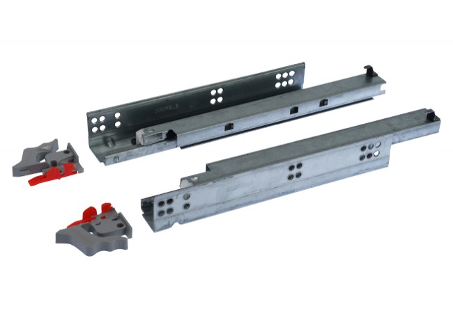 Prowadnica HAFELE Favorit.Wysuw pełny z hamulcem.Udźwig do 30 kg, montaż ze sprzęgłem, z samodomykiem i amortyzacją.Wykonana ze stali.