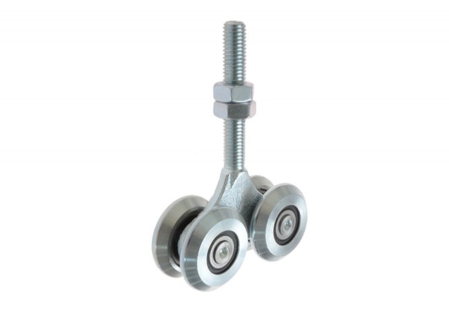 Wózek z 4 kółkami skośnymi, stalowymi, ocynkowanymi o średnicy 44mm. Kółka łozyskowane. Wózek odpowiedni dla bram wiszących konstruowanych na bazie szyny G10Z. Całkowita długość śruby 56mm, gwint M12. Przy zastosowaniu 2 wózków, nośność wynosi 650kg.