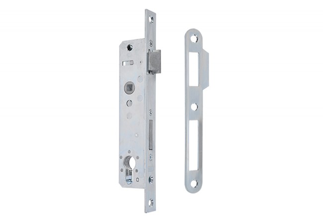 Description - HOBES K431 mortise lock, 90/35 WB with striker, white galvanized