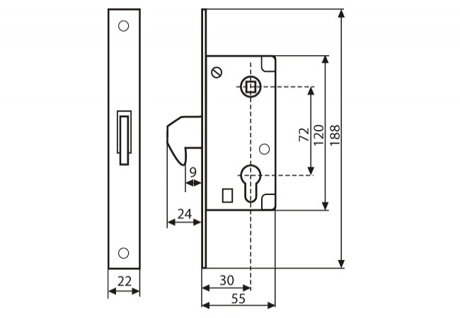 GREAT PRICE! Mortise lock 72/30, designed for entrance gates, sliding entrance doors, etc. The 9mm hinge hook is lifted and locked with the insert, not retracted to the lock cassette. Handle for the handle with a hole under the mandrel 8mm. Hitch and moun
