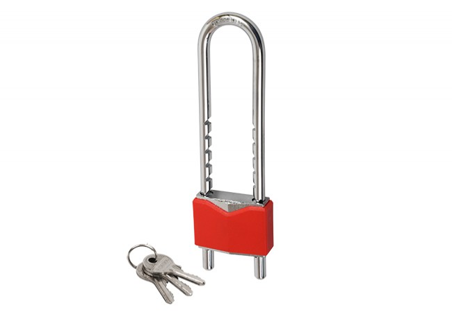 Kłódka mosiężna B-Harko 50 mm w osłonie z regulowanym pałąkiem, czerwona