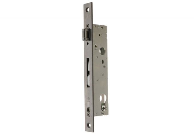 Zamek wpuszczany, rolkowo-zasuwkowy do profili tworzywowych.Zasuwka opadająca. Uniwersalna stronność.