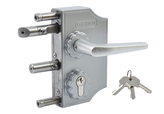 Description - LAKQ-H2 Locinox decorative lock for gates with a 40 mm profile, aluminum (ZILV), straight silver handle