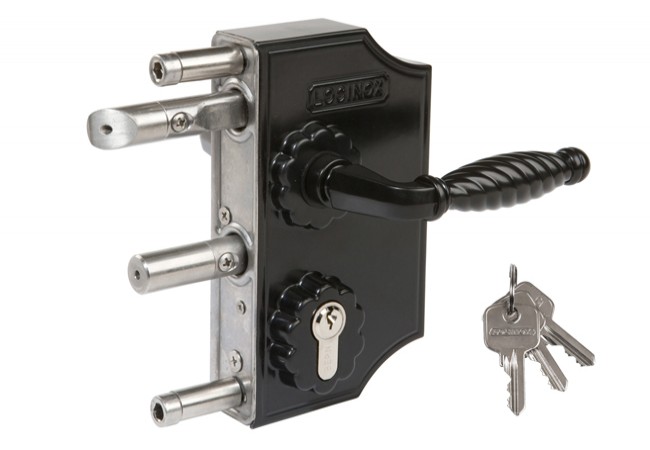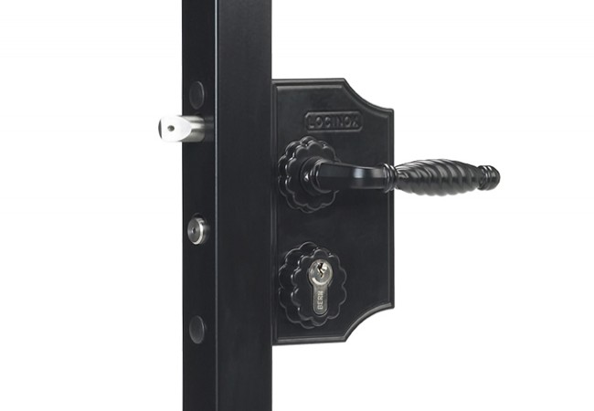 Locinox decorative lock for gates and doors with aluminum casing and stainless mechanism. We recommend this product as a standard hardware for forged doors. By one turn of the span, the keel stroke is 23 mm, which secure closure.