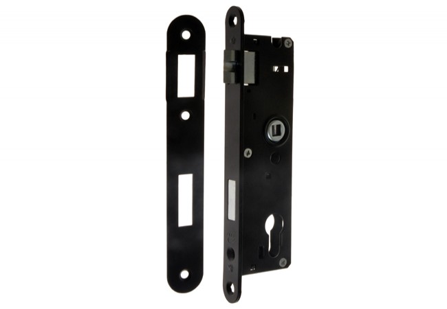 Mortise lock for aluminum or steel joinery. Dimensions: - spacing - 72mm - dormas - 34mm Finish: lacquered; Manufacturer: "Metalplast-Częstochowa"
