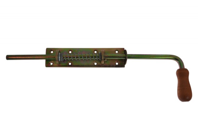 Zasuwa sprężynowa z drewnianym uchwytem w stylu rustykalnym.