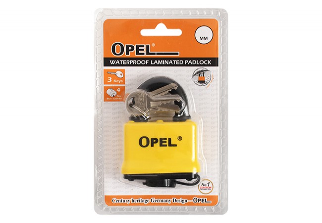 Kłódka pałąkowa OPEL wodoodporna z osłoną cylindra, laminowana, 3 klucze nacinane
