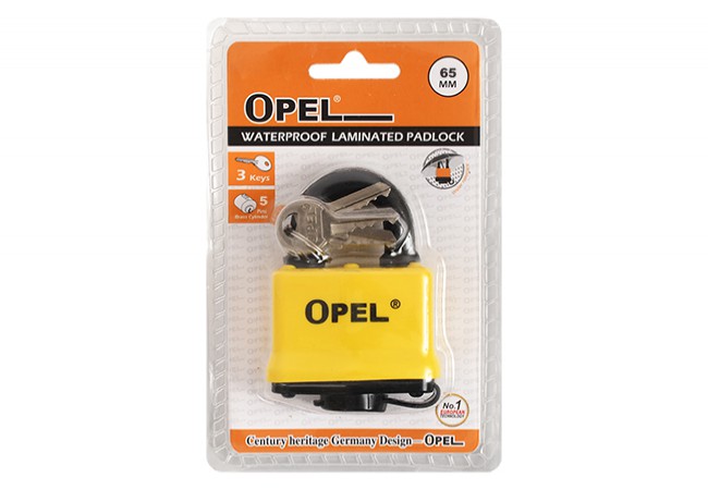 OPEL 65 waterproof shackle padlock with cylinder cover, laminated, 3 notched keys