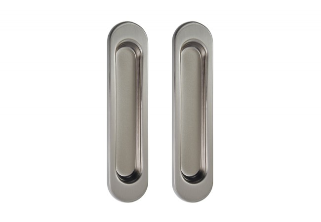 Description - Oval flush-mounted sliding door handle B-HARKO R003SN 151x35 mm, satin nickel (2 pieces)