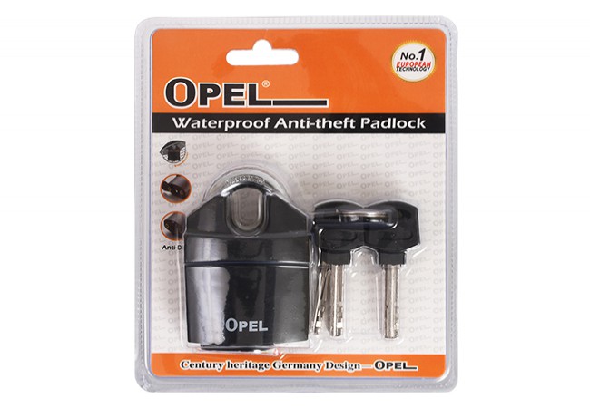 Kłódka z krytym pałąkiem OPEL wodoodporna, laminowana, 4 klucze