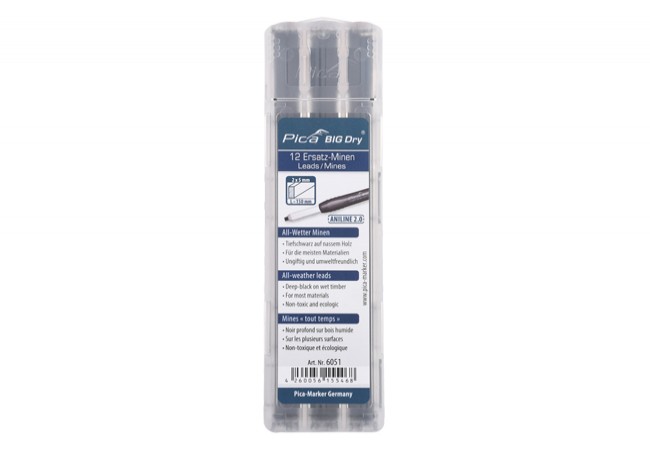 Wkłady grafitowe wymienne Pica Big Dry do mokrych powierzchni ANILINE 2.0. Zapewniają odpowiedni kontrast na mokrym drewnie. W wygodnym i odpornym na uszkodzenia opakowaniu znajduje się 12 wkładów osobno pakowanych dla lepszego zabezpieczenia. Prostokątne wkłady o wymiarze 2 x 5 mm i długości 150 mm starczają na bardzo długo. Produkt przyjazny środowisku.