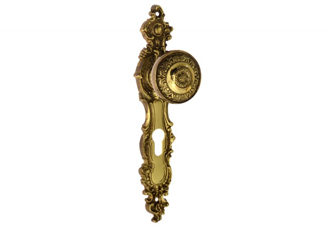 Gałko-gałka w kolorze złotym będzie stanowiła świetną alternatywę dla tradycyjnej klamki drzwiowej w pałacach i budynkach sakralnych. Wykorzystuje się tam często drzwi rzeźbione, które doskonale harmonizują z mosiężnymi okuciami. Efektowna gałko-gałka obrotowa z długim szyldem zachwyca nie tylko swoim bogatym zdobieniem, ale i funkcjonalnością. Gałki mosiężne montuje się niezwykle prosto, bez konieczności posiadania profesjonalnego sprzętu. Produkty te posiadają specjalny otwór, w którym możemy umieścić wkładkę bębenkową, przez co nasze drzwi będą bardzo bezpieczne. Gałko-gałki występują w wydaniu złotym oraz postarzanej patynie. Dostępne są różne wzory, więc w zależności od potrzeb możemy sięgnąć po kwiatowe wzory, secesyjne zdobienia czy subtelniejsze ornamenty wpisujące się w styl vintage.