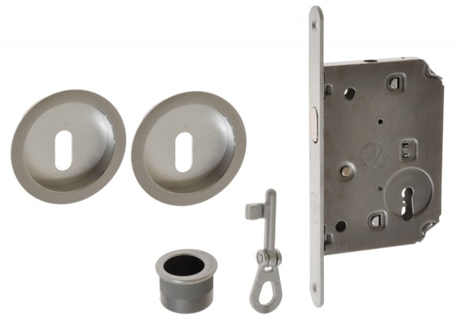 Description - Sliding door lock + round handles with folding key, matt chrome