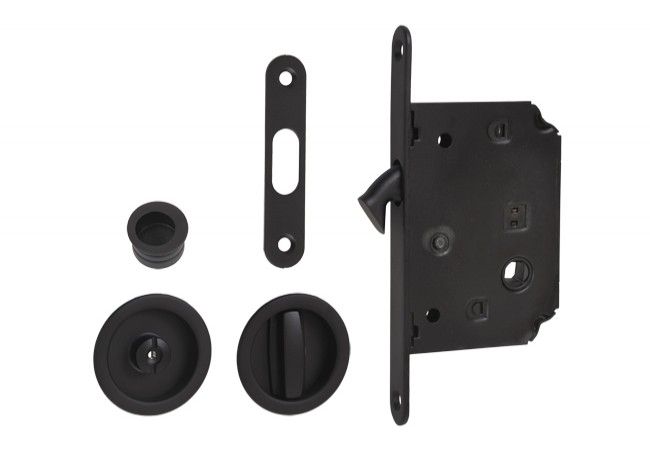 W skład zestawu wchodzą: zamek wpuszczanyzaczepdwa okrągłe szyldy wpuszczane z blokadą WCuchwyt wpuszczany.