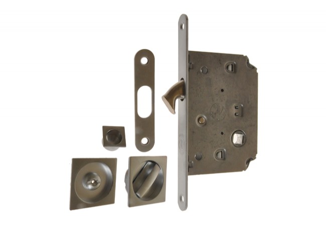 The set includes: mortise lock, hinge, key two square plates with toilet locking recessed handle.