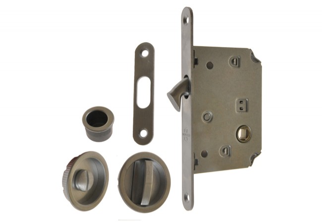 The set includes: mortise lock, hook recessed handle, two rounded plate with toilet locking recessed handle