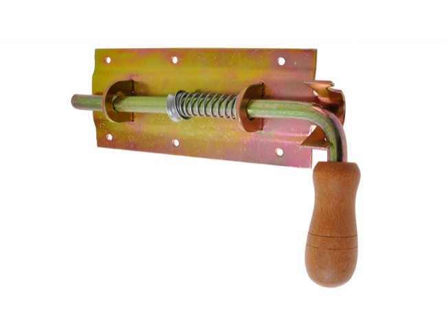 Zasuwa sprężynowa z drewnianym uchwytem w stylu rustykalnym.