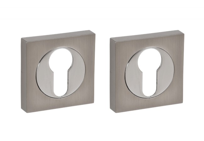 Tarczka kwadratowa o pokryciu nikiel-satyna/chrom marki B-Harko. System zamykania na wkładkę. Osłona tarczki wciskana na podstawę. Śruby montażowe pozostają całkowicie niewidoczne.