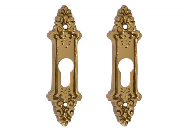Ozdobny szyld drzwiowy który będzie stanowić znakomite dopełnienie skrzydeł wejściowych dworków i pałaców. Element występuje w kolorze złotym oraz patynie, dzięki czemu idealnie dopasujesz go do reszty okuć: klamek, zawiasów i akcesoriów wewnątrz pomieszczeń. Cechami, które zachęcają potencjalnych klientów są z pewnością atrakcyjny i elegancki wygląd, a także solidne wykonanie. Szyld ozdobny komponuje się perfekcyjnie z drewnianymi skrzydłami oraz tłoczonymi frontami Produkt powstał w 100% z mosiądzu, dzięki czemu cechuje się wysoką wytrzymałością mechaniczną. Rozeta wykazuje dużą odporność na czynniki atmosferyczne: wodę, promieniowanie, mróz. Posiada on otwór na wkładkę cylindryczną, która ma zapewnić pełnię ochrony naszej posiadłości. Ozdobny design dopasowany do klasycznych wnętrz, świetna jakość i bezkonkurencyjna cena.