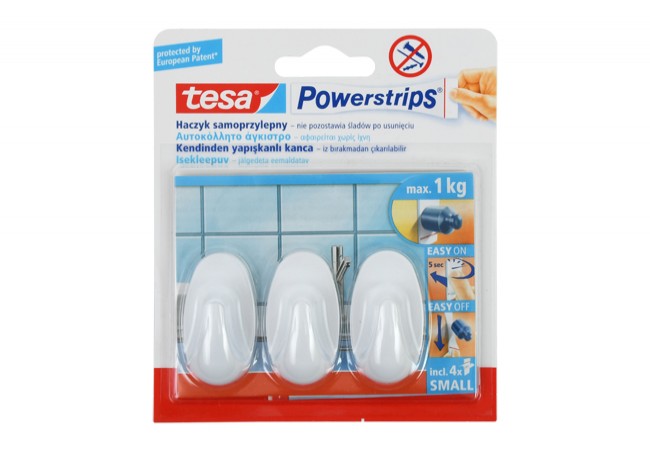 Description - Tesa Powerstrips Adhesive Hook, Load Capacity up to 1 kg, Oval, White (3 pcs.)
