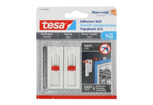 Description - Tesa Powerstrips Adjustable Adhesive Wallpaper Nail, Load Capacity up to 1kg, White (2 pcs.)