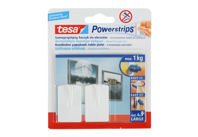 Description - Tesa Powerstrips self-adhesive picture hook, load capacity up to 1 kg, white (2 pcs.)