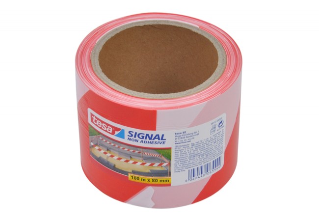 Description - Tesa Signal adhesive-free safety warning tape, white and red, double-sided print, length 100 m, width 80 mm