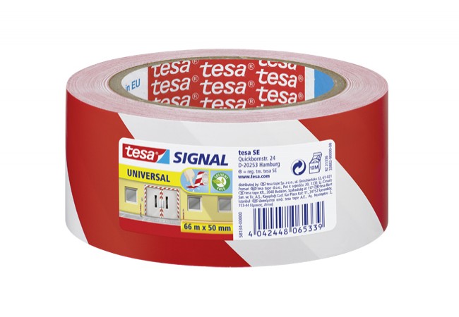 Description - Tesa Signal Universal Occupational Safety Warning Tape, white and red, length 65m, width 55mm