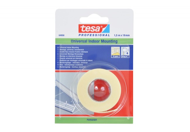 Description - Tesa Universal Indoor Mounting Double-Sided Foam Mounting Tape, White, Length 1.5 m, Width 19 mm